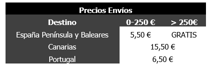 Se realizan envíos en España y Portugal, los gastos de estos se muestras a continuación.